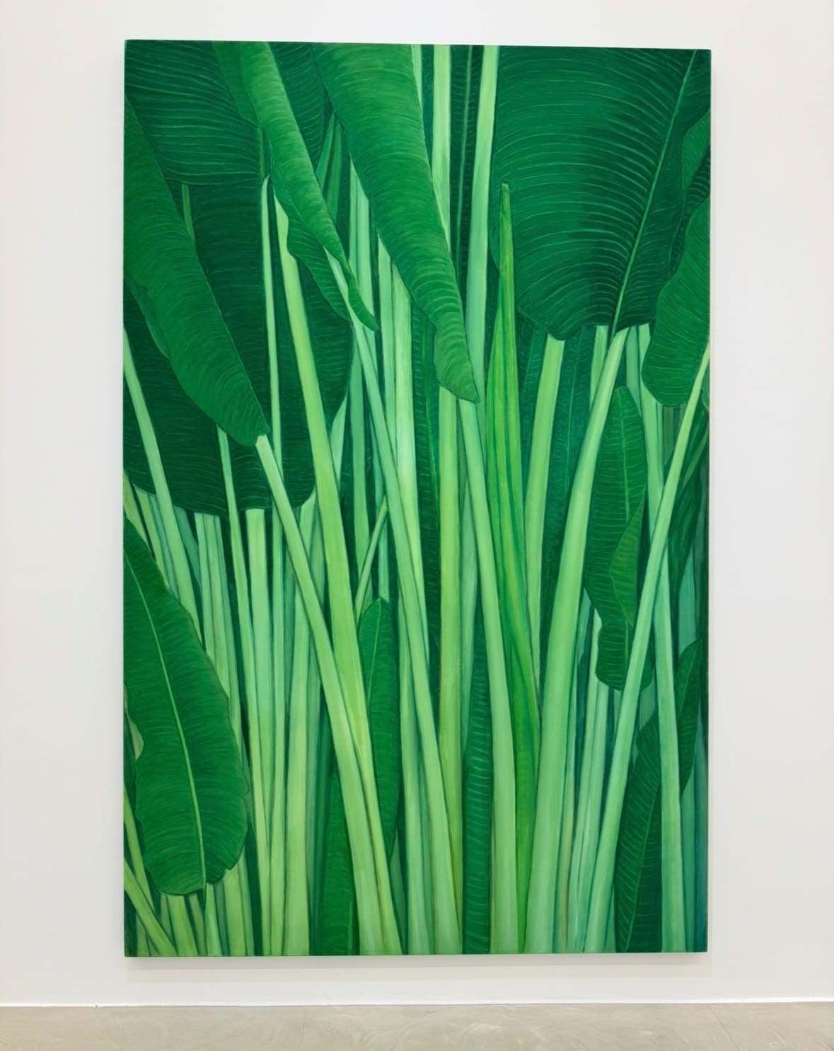 Il dialogo con l’architettura della galleria è sottile e preciso. Le tele sembrano respirare nello spazio, lasciando emergere dettagli botanici, scorci dilatati, frammenti naturali che oscillano tra astrazione e memoria. È qui che la ricerca di Kim Bohie si rivela pienamente: nella capacità di trasformare la natura in esperienza interiore.