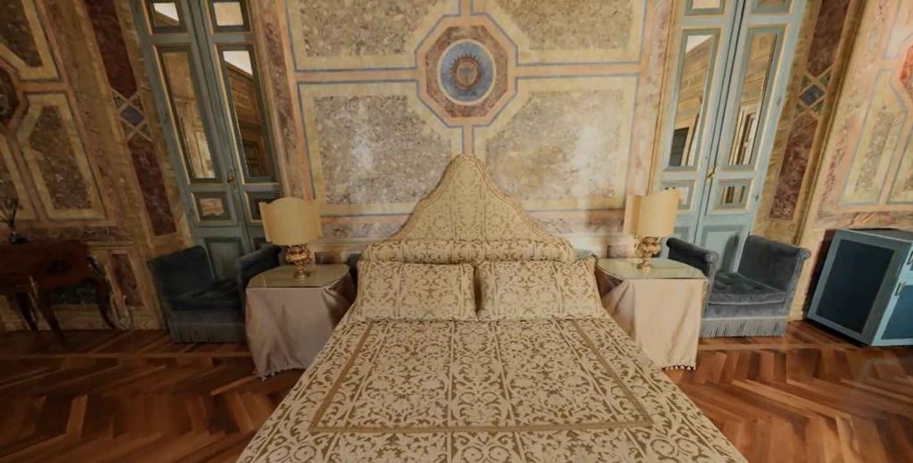 La stanza da letto è maestosa e irripetibile. L’ambiente è interamente marmorizzato: un procedimento molto difficile da realizzare. In questo luogo ha dormito, ovviamente Napoleone III, perdutamente innamorato della Città Eterna e delle sue bellezze artistiche. Ma anche il regista Woody Allen, Cristopher Lambert e Riccardo Scamarcio.