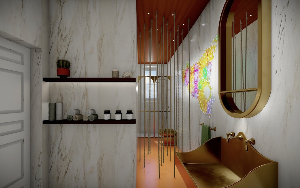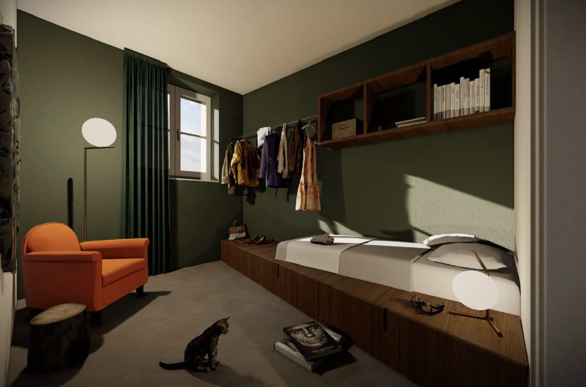 La sostenibilità e l’impatto ambientale coincidono esattamente con scelte materiche naturali, caratterizzate da semplicità e da un linguaggio volutamente minimale. La pavimentazione dell’intera unità abitativa è stata ipotizzata in calce naturale e inerti con finitura cerata, mentre le pareti sono realizzate con intonaco a biocalce, ottenendo superfici volutamente disomogenee e imperfette.